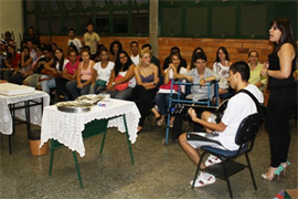 Já em sala de aula, acadêmicos de todos os semestres participaram de uma confraternização, recebendo as boas vindas dos professores, que comentaram sobre os momentos especiais dentro do curso. Na sequência, os acadêmicos acompanharam uma apresentação musical e a leitura de textos literários, ambos apresentados por colegas de curso.