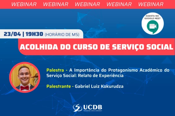 A Universidade Católica Dom Bosco (UCDB) promoverá no dia 23 de abril, às 19h30, acolhida do curso de Serviço Social. O evento acontecerá via Google Meet, com o tema “A importância do protagonismo acadêmico de Serviço Social”, com o palestrante Gabriel Luiz Kokurudza, que enfatizará as oportunidades que os acadêmicos terão durante o curso.