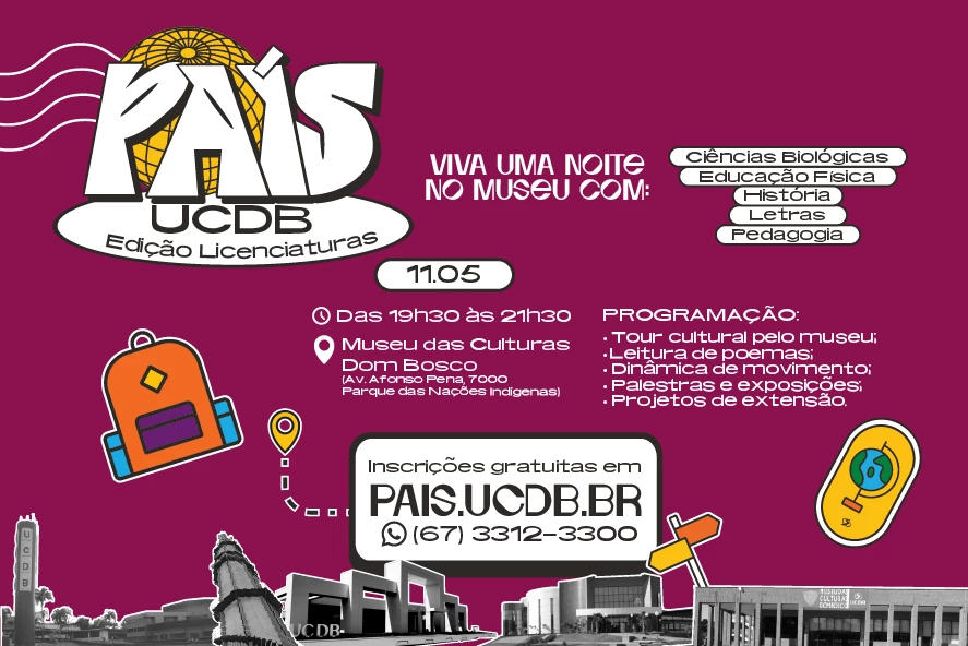 Um país é construído diariamente por muitas atividades, saberes, relações, características. Assim funciona, também, o País UCDB — uma universidade única, com múltiplas formas de ensinar, aprender e formar. E, para conhecer um pouco mais sobre o universo dos cursos de Licenciaturas (Letras, Pedagogia, Ciências Biológicas, Educação Física e História), a Universidade Católica Dom Bosco prepara um evento especial no Museu das Culturas Dom Bosco no dia 11 de maio, a partir das 19h30.