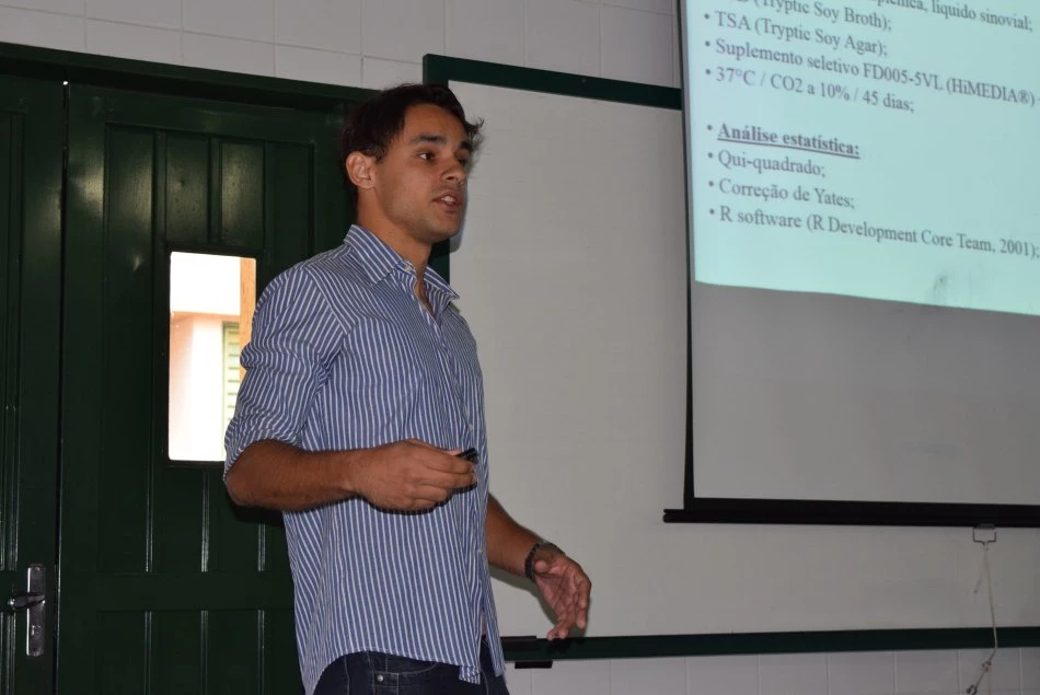 Gabriel explicou, primeiramente, o que é a brucelose e os efeitos que ela causa nos animais, e em seguida falou sobre a ocorrência da doença, causada pela bactéria do gênero Brucella nos equinos. “Os equinos são considerados, por muitos autores, o hospedeiro terminal; nele a bactéria da brucella se hospeda somente por coabitação com seus hospedeiros preferenciais (o boi e o porco)”, esclareceu o mestrando. Ele abordou ainda a vacinação que ocorre no Brasil para prevenção da doença e da fístula de cernelha.