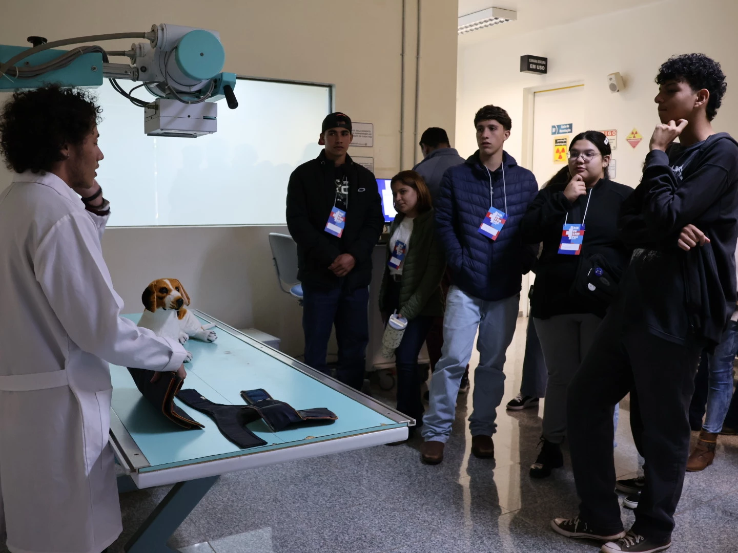 Divididos em sete grupos, os estudantes percorreram as estações montadas no Hospital Veterinário (Hovet). “A infraestrutura é incrível. Vimos a sala de cirurgia de grandes animais que existem em poucos locais. É tudo muito completo”, encantou-se Dafini Vareiro, que é estudante do curso técnico de auxiliar veterinário.