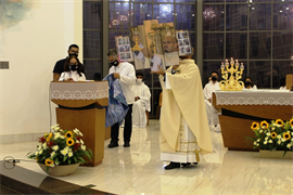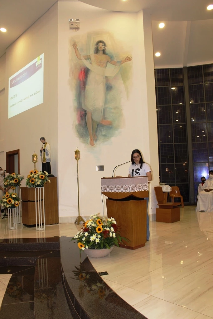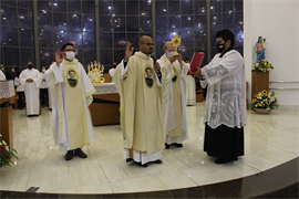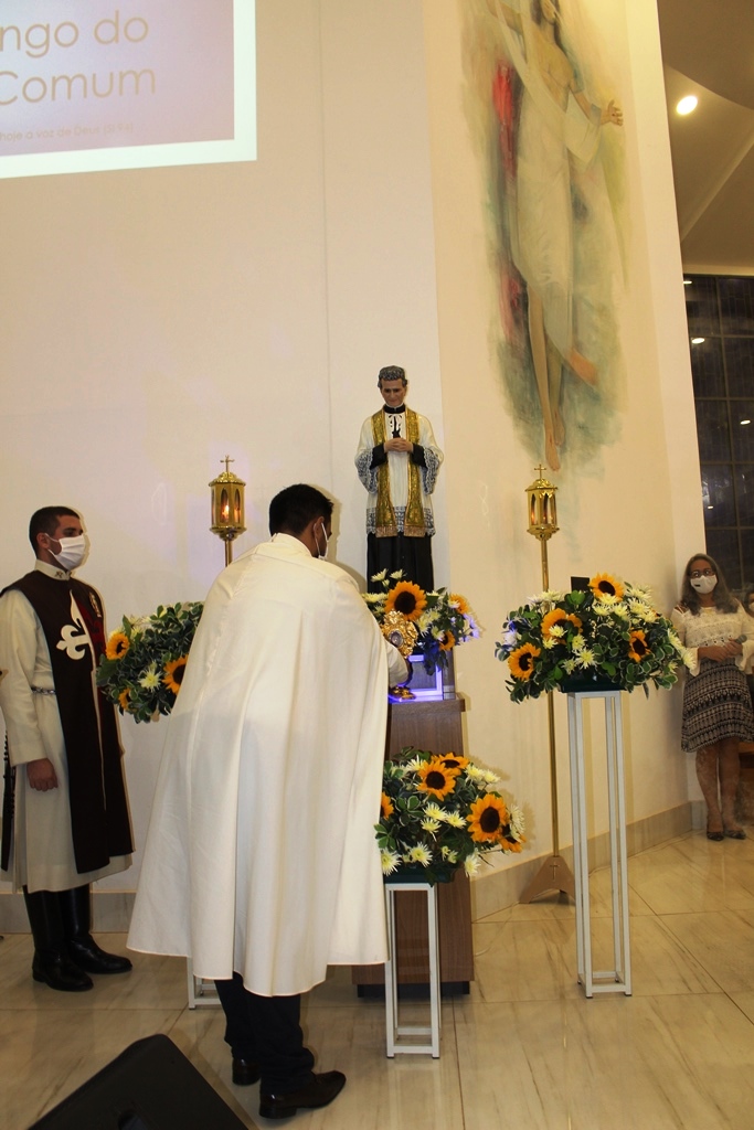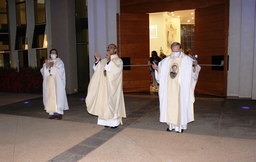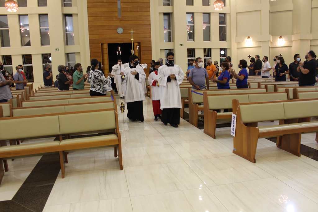 Ao som de cornetas, integrantes dos Arautos do Evangelho entraram com a relíquia e a imagem de Dom Bosco, embalados pelo Hino de São João Bosco: ?Tu és Dom Bosco Pai e Mestre de toda Juventude, Tu és Dom Bosco menino pobre que a Deus amou. Tu é Dom Bosco somos o teu sonho de concretizado. Tu és Dom Bosco nós somos os teus queridos jovens amados.?
