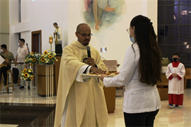 Ao final da celebração o Padre Idenilson agradeceu ao Padre Marinoni a oportunidade de integrar a comunidade salesiana. “O Padre Marinoni é verdadeiramente um pai, que me acolhe e me orienta. A presença do senhor em minha vida traz segurança para poder trabalhar e esperança para seguir esse ministério”, agradeceu o Padre Idenilson, estendendo os cumprimentos a toda a comunidade educativa UCDB. A Paróquia também o homenageou pelo primeiro ano de sacerdócio e entregou um quadro e uma túnica.