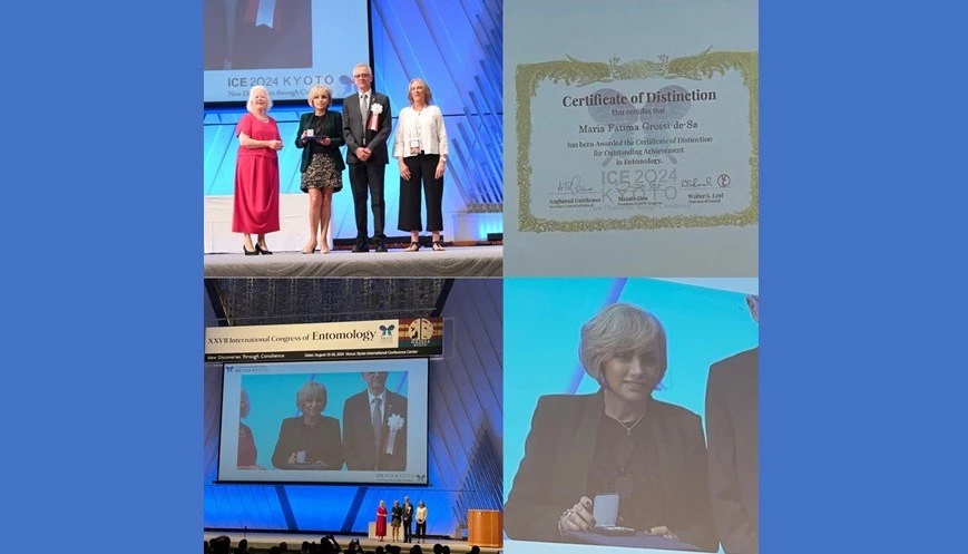 A professora Fatima Grossi, do Programa de Pós-Graduação mestrado e doutorado em Biotecnologia da Universidade Católica Dom Bosco (UCDB), que também é pesquisadora da Embrapa Recursos Genéticos e Biotecnologia (DF), conquistou no dia 25 de agosto, em Kyoto (Japão), o prêmio máximo da entomologia mundial: o Certificado de Distinção pelo Conselho do Congresso Internacional de Entomologia.