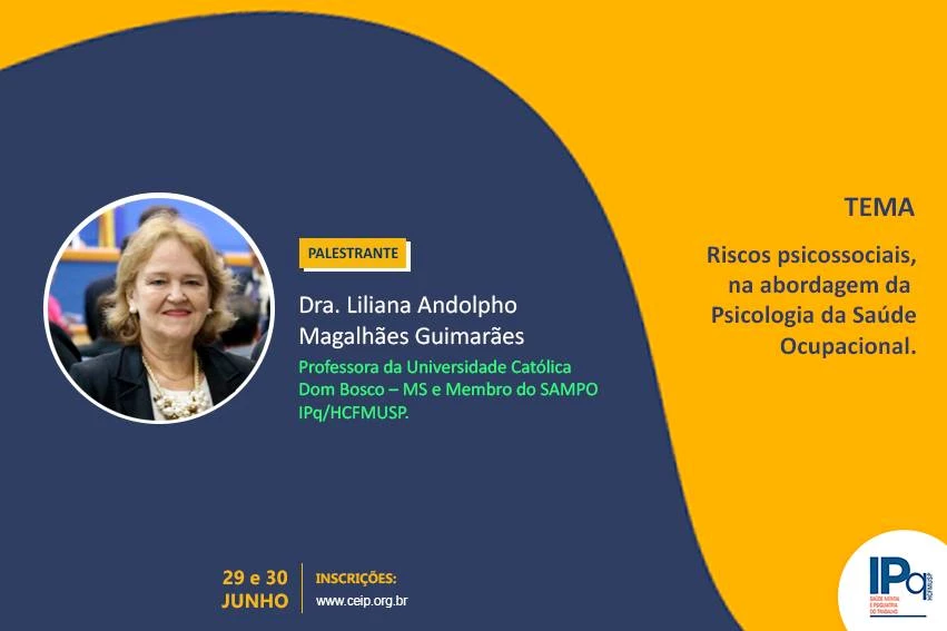 Nesta sexta-feira (29) e sábado (30), a professora do Programa de Pós-Graduação em Psicologia da Universidade Católica Dom Bosco (UCDB) Dra. Liliana Andolpho Magalhães Guimarães participa do “I Simpósio de Transtornos Mentais Relacionados ao Trabalho e Psiquiatria do Trabalho” que será realizado no Instituto de Psiquiatria do Hospital das Clínicas da Faculdade de Medicina da Universidade de São Paulo (IPq/HCFMUSP), localizado na capital paulista.