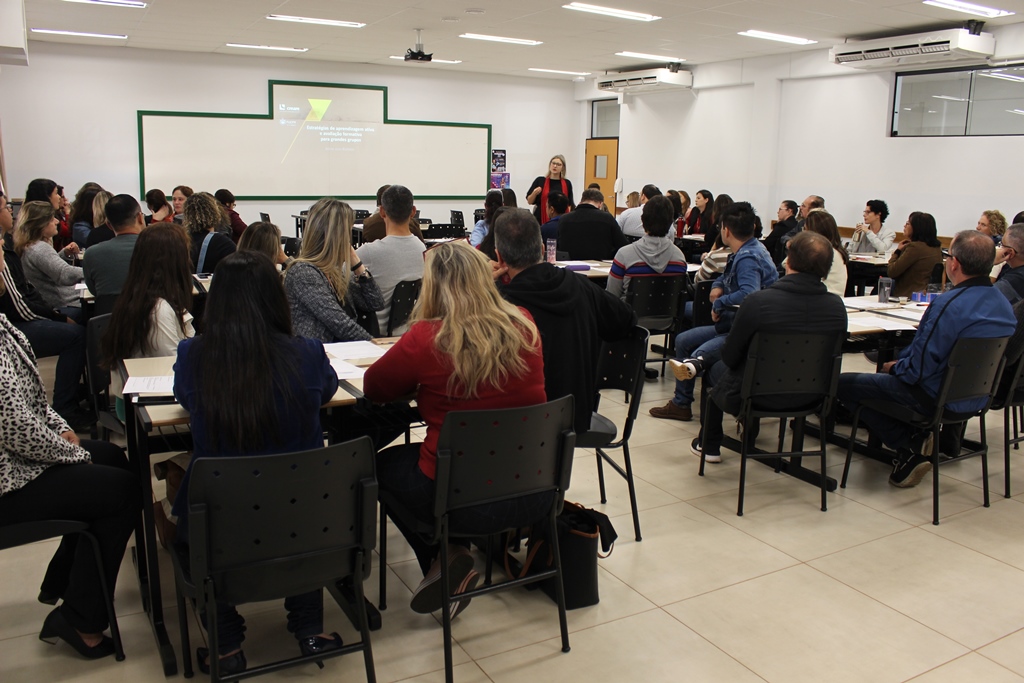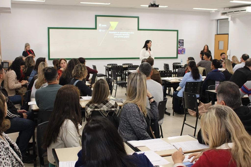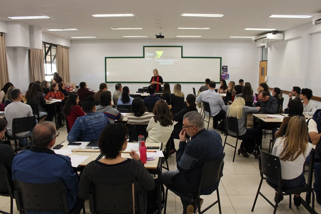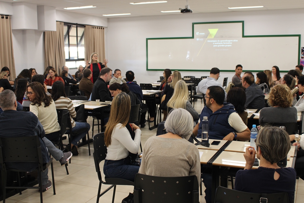 Professores da área da saúde da Universidade Católica Dom Bosco (UCDB) participaram nesta manhã (17) da oficina “Estratégias de aprendizagem ativa e avaliação formativa para grandes grupos”, ministrada pela coordenadora do Centro de Ensino e Aprendizagem (CREARE) da Pontifícia Universidade Católica do Paraná (PUC/PR), Dra. Aline Von Bahten. A Pró-Reitora de Graduação e Extensão, Rúbia Renata Marques, fez a abertura destacando o Projeto Pedagógico Institucional (PPI) da Católica. O evento também contou com a presença do Pró-Reitor de Desenvolvimento Institucional (Prodi), Ir. Gillianno Mazzetto.