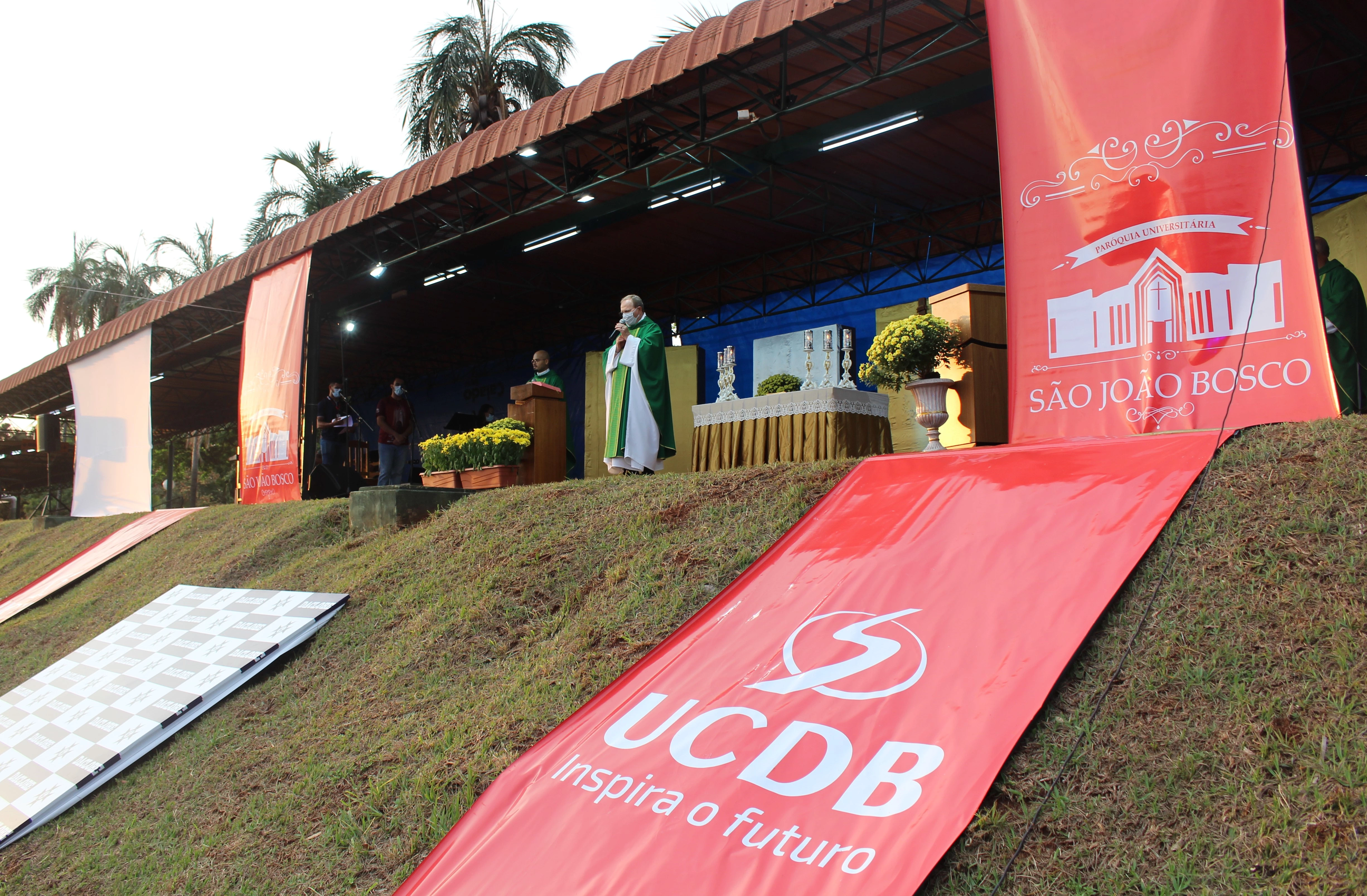 Professores da Universidade Católica Dom Bosco (UCDB) foram homenageados neste sábado (24) ao final da missa drive in, organizada pela Pró-Reitoria de Pastoral e Assuntos Comunitários. A eucaristia, presidida pelo Reitor da UCDB, Pe. José Marinoni, e concelebrada pelos padres Wilson Cardoso, Adriano Estevaneli e Idenilson Lemes, também foi dedicada a Nossa Senhora Aparecida, que contou com a participação de um grupo de motoqueiras escoltando a entrada da imagem peregrina.