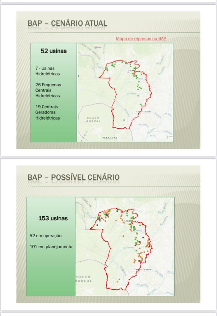O estudo detalha que em volta Pantanal já existem 52 usinas instaladas, barrando rios, causando severos impactos ambientais, econômicos e sociais, por envolver comunidades ribeirinhas. “Além dessas usinas em operação, estão previstas a instalação de mais 101 projetos na bacia do alto rio paraguai. Se todas essas usinas se viabilizarem, a gente corre um sério risco de perder o Pantanal como ele é conhecido hoje, pois vamos ter uma alteração muito brusca em sua dinâmica. A gente saí do pressuposto que essas usinas são muito importantes, só que elas geram pouquíssima energia, nem 1% do total de energia hídrica brasileira”, completa a pesquisadora.