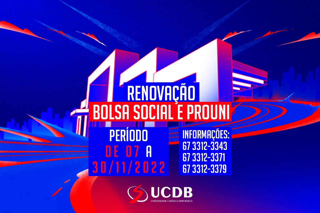 A Universidade Católica Dom Bosco divulga os editais de renovação da Bolsa Social e Prouni para 2022B. As inscrições estarão abertas de 7 a 30 de novembro. Podem participar quem já tem a Bolsa Social e Prouni e estiver regularmente matriculado neste semestre, que comprove vulnerabilidade socioeconômica, inscreva-se no prazo, tenha aproveitamento de, no mínimo, 75% das disciplinas cursadas, que não tenha tido o cancelamento do benefício anteriormente e não usufrua de outros descontos ou bolsas oferecidos pela Missão Salesiana de Mato Grosso.