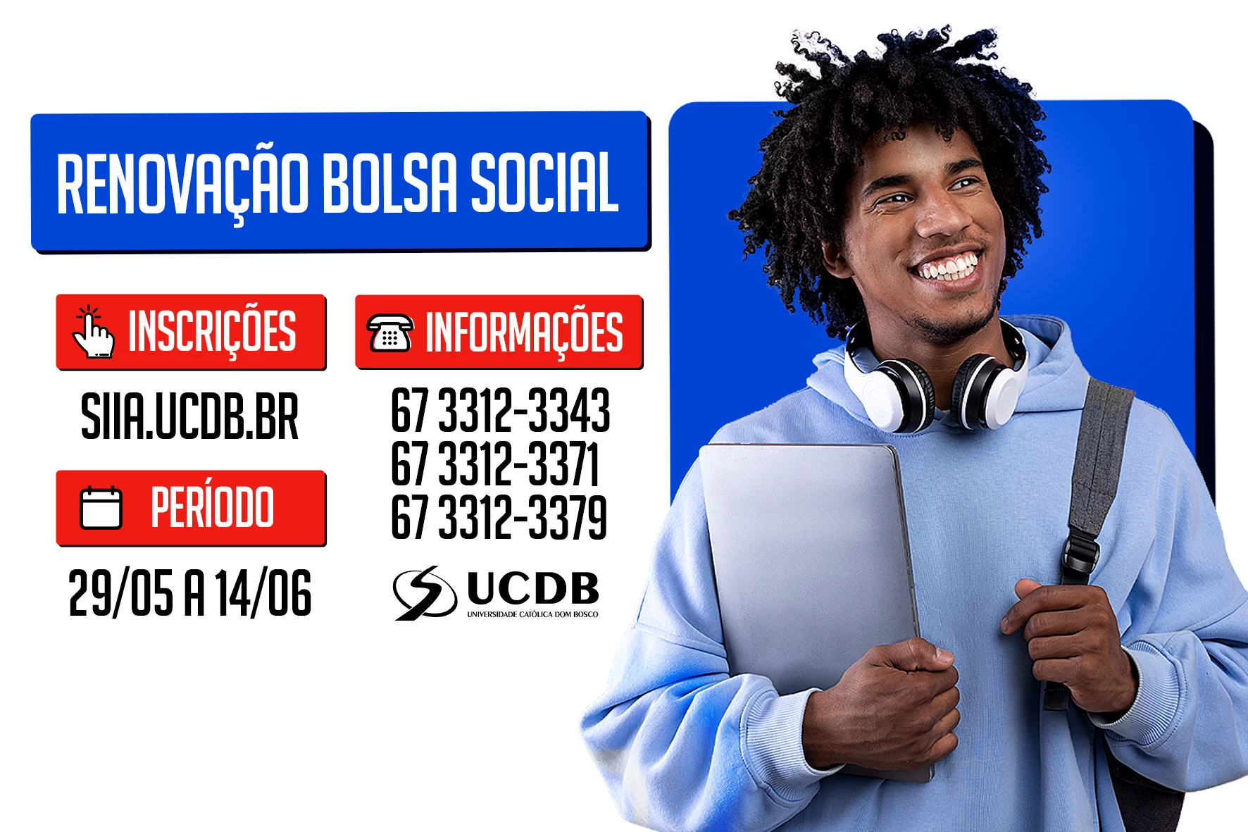 A Universidade Católica Dom Bosco divulgou nesta segunda-feira (29) os editais de renovação da Bolsa Social para 2023A. As inscrições estarão abertas de 29 de maio a 14 de junho. Devem participar os beneficiários à Bolsa Social que estejam regularmente matriculados neste semestre, que comprovem vulnerabilidade socioeconômica, inscreva-se no prazo.