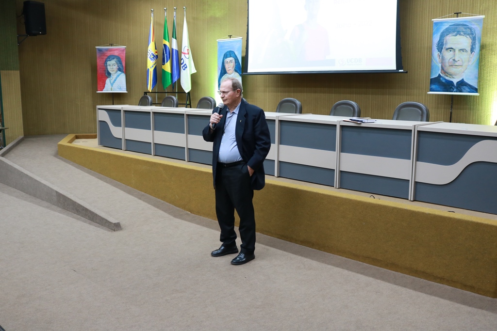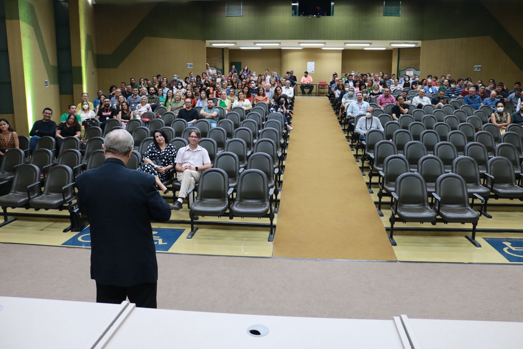 A Universidade Católica Dom Bosco (UCDB) realizou, ontem (27), a Acolhida Docente 2022B com o tema “A educação superior e o futuro”, reunindo no auditório do bloco A professores, coordenadores de curso e os pró-reitores Pe. Idenilson Lemes da Conceição (Pastoral e Assuntos Comunitários), Dra. Rúbia Renata Marques (Graduação e Extensão) e Dr. Cristiano Marcelo Espínola Carvalho (Pesquisa e Pós-graduação), além do Reitor da Católica, Pe. José Marinoni.