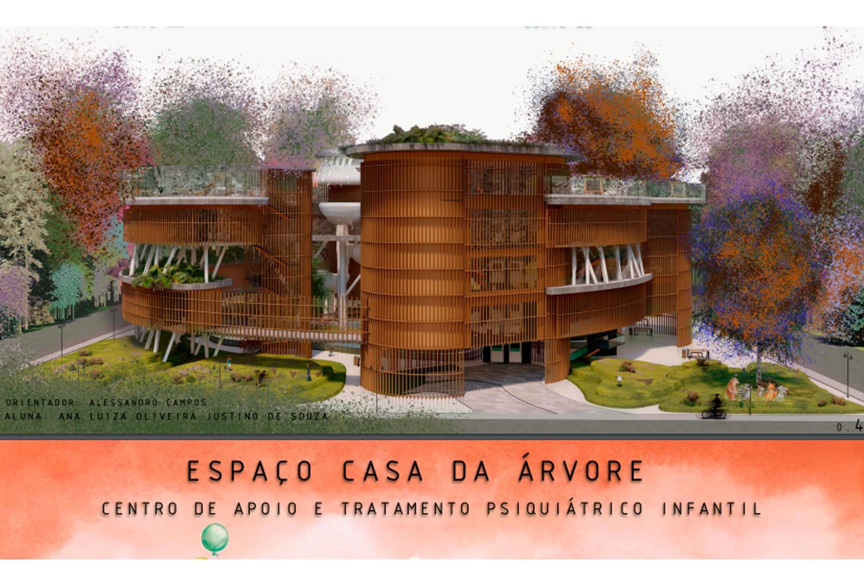 Em seu trabalho, Ana Luiza propôs a construção do “Espaço Casa da Árvore”, um centro de apoio e tratamento psiquiátrico para crianças e jovens no bairro de São Lourenço, em Campo Grande-MS. “Primeiro eu tinha o tema em mente, mas relutei muito contra ele pois fiquei com medo de ser um tema muito complicado e difícil de desenvolver, eu tentei trazer mais leveza e conforto por ser um tema tão polêmico. Busquei expor a importância da saúde mental como problema básico de saúde pública; analisar o cenário da saúde mental das crianças e adolescentes durante e após a pandemia de COVID-19; compreender a neuroarquitetura e a arquitetura biofílica, a fim de promover uma relação positiva entre espaço e pessoa, com foco no tratamento psiquiátrico; compreender a dificuldade de acesso a tratamento psiquiátrico, pelas crianças especiais e promover um espaço para convívio, bem-estar e tratamento para crianças e adolescentes que necessitam de amparo psicológico e fisioterápico”, explicou.