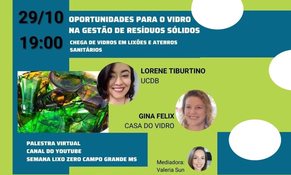“Vamos abordar os seguintes temas: economia circular, logística reversa, e empreendedorismo a partir dos resíduos, solução para vidros através do ecodesign, como a experiência da empresa Casa do Vidro, em Bonito”, destaca a egressa.