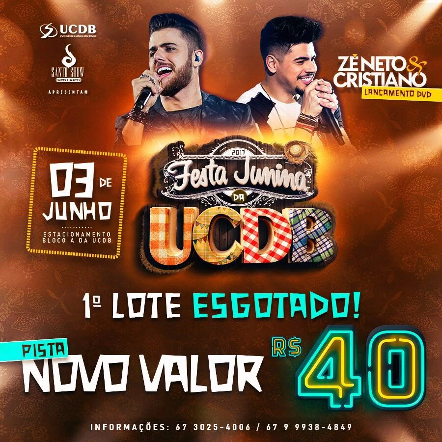 O primeiro lote de ingressos para pista da Festa Junina da Universidade Católica Dom Bosco (UCDB) está esgotado e agora, o segundo lote é vendido a R$ 40 a inteira e R$ 20 a meia entrada, em dois locais: Gugu lanches, Fast Tickets e no SeR UCDB. Para os camarotes, os ingressos já estão no terceiro lote, a R$ 120, e a meia entrada já está esgotada. A 11ª edição da festa Junina UCDB será no dia 3 de junho e contará com o lançamento do DVD de Zé Neto & Cristiano, além de duplas sertanejas regionais.
