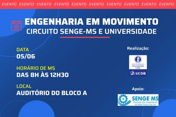 A Universidade Católica Dom Bosco (UCDB) recebe, na quinta-feira (05/06), edição especial do “Engenharia em Movimento, Circuito Senge-MS e Universidade”, promovido pelo curso de Engenharia Civil, em parceria com o Sindicato dos Engenheiros de Mato Grosso do Sul (Senge-MS). O evento acontecerá das 8h às 12h30, no auditório do Bloco A, e será voltado exclusivamente para acadêmicos dos cursos de Engenharias e Agronomia.