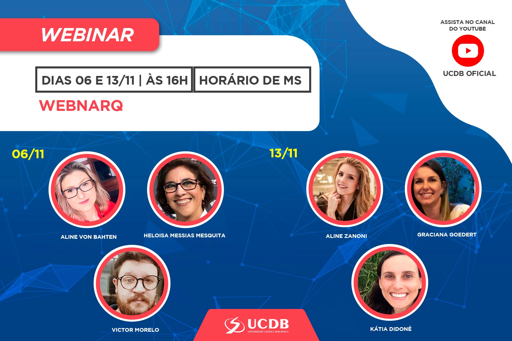 A Universidade Católica Dom Bosco (UCDB), por meio do curso de Arquitetura e Urbanismo, realiza nos dias 6 e 13 de novembro, às 16 horas, o ‘WebnArq’ para discutir a atuação profissional, evento destinado para acadêmicos, com transmissão on-line pelo Youtube oficial da Católica.