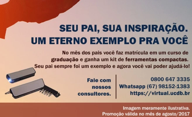 Quem se matricular na UCDB Virtual até o dia 31 de agosto ganha um Kit de ferramentas compactas com 6 fendas e uma lanterna. A promoção, realizada em homenagem ao Dia dos Pais, é válida só para os cursos de graduação e vai presentear os 100 primeiros alunos que efetuarem a matrícula.