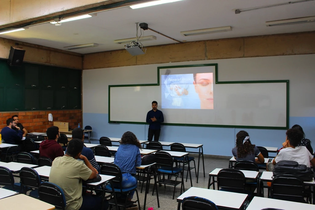 O farmacêutico Luiz Fernando Quinones, egresso da Universidade Católica dom Bosco (UCDB), contou um pouco de sua experiência no mercado de trabalho para acadêmicos do primeiro semestre do curso de Farmácia. A atividade faz parte da disciplina ‘Introdução a farmácia’, ministrada pela professora Marla Ribeiro Arima Miranda, que coordenada o curso, que neste ano também passou a ser oferecido no período noturno.