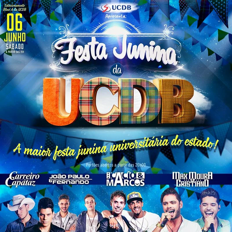 No dia 6 de junho será realizada a tradicional festa junina da Universidade Católica Dom Bosco (UCDB), que acontece todos os anos com muita música boa, comidas típicas e barracas animadas organizadas pelos acadêmicos da Católica. Os acadêmicos da Instituição podem comprar os ingressos por um preço especial até o dia 29 de maio no valor de R$ 10,00.