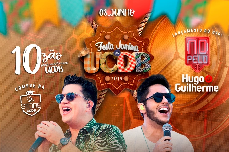 Este ano, a maior festa junina universitária de Mato Grosso do Sul será realizada no dia 8 de junho e traz como atração principal a dupla goiana Hugo e Guilherme. Os cantores seguem na música desde 2015, com sucessos como “Conveniência”, “Na maldade” e “Imagina”. Além de terem conquistado todo o Brasil, eles já têm uma afinidade com a capital sul-mato-grossense onde gravaram o terceiro DVD — “No pelo em Campo Grande”. A dupla dividiu o palco com Henrique e Juliano e Marília Mendonça e apresentou os novos hits “Teste da mãozinha” e “Toda ida pede volta”.