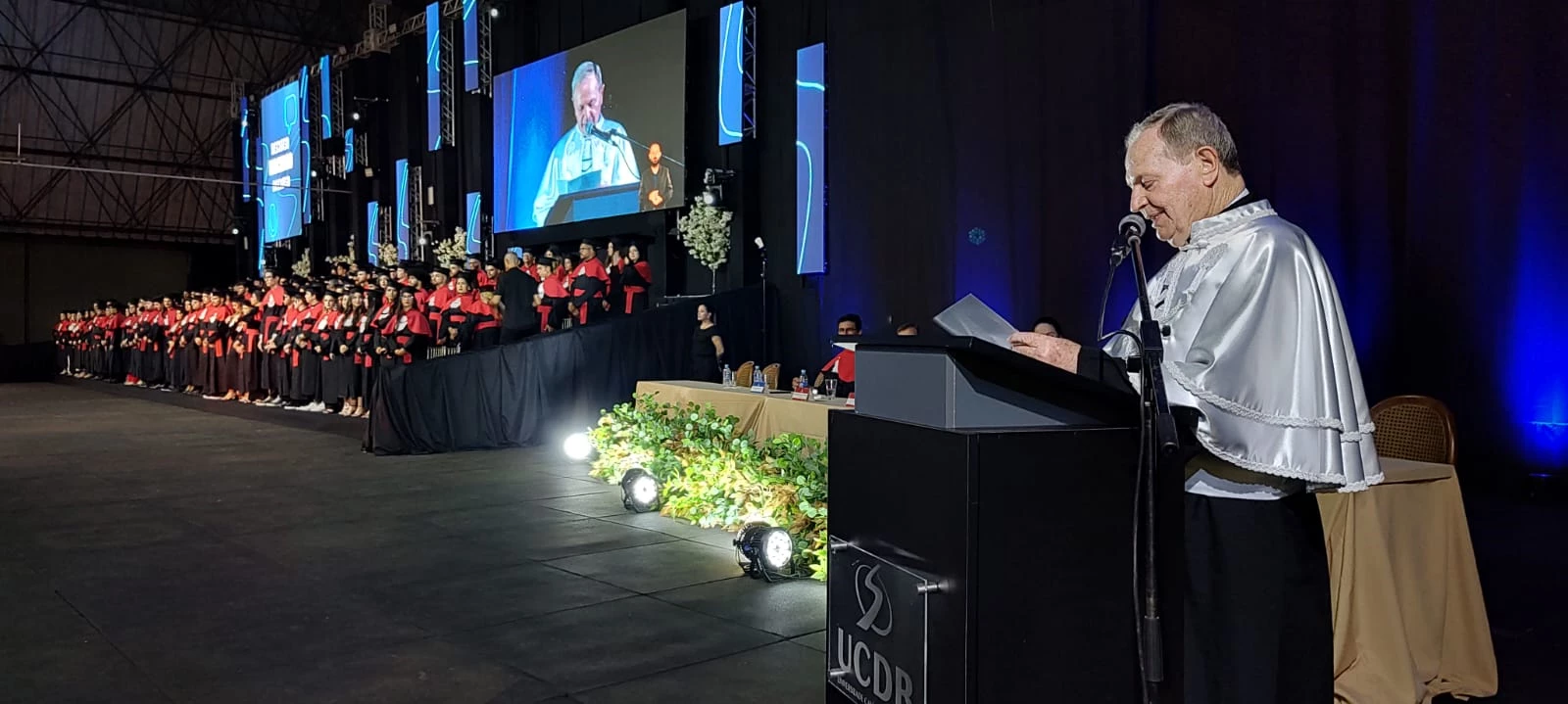 “É um grande privilégio estar aqui nesta noite, para celebrar este momento tão especial e muito significativo na vida de vocês, que certamente será lembrado não apenas como o encerramento de uma longa jornada, mas também como início de uma nova etapa, um novo ciclo repleto de possibilidades, mas também de desafios. É um marco na caminhada que começou há alguns anos, mas que com certeza seguirá por toda a vida”, destacou o Reitor da UCDB, Pe. José Marinoni.