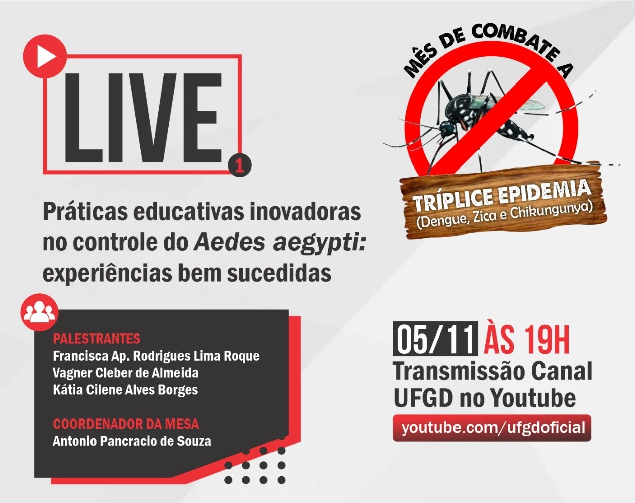 Serão quatro lives, começando na próxima quinta-feira (5), às 19h, com a palestra de Kátia Cilene Alves Borges, Francisca Aparecida Rodrigues Lima Roque e Vagner Cleber de Almeida. O tema será “Práticas educativas inovadoras no controle de Aedes aegypti: experiências bem sucedidas”. O debate será coordenado por Antonio Pancracio de Souza.