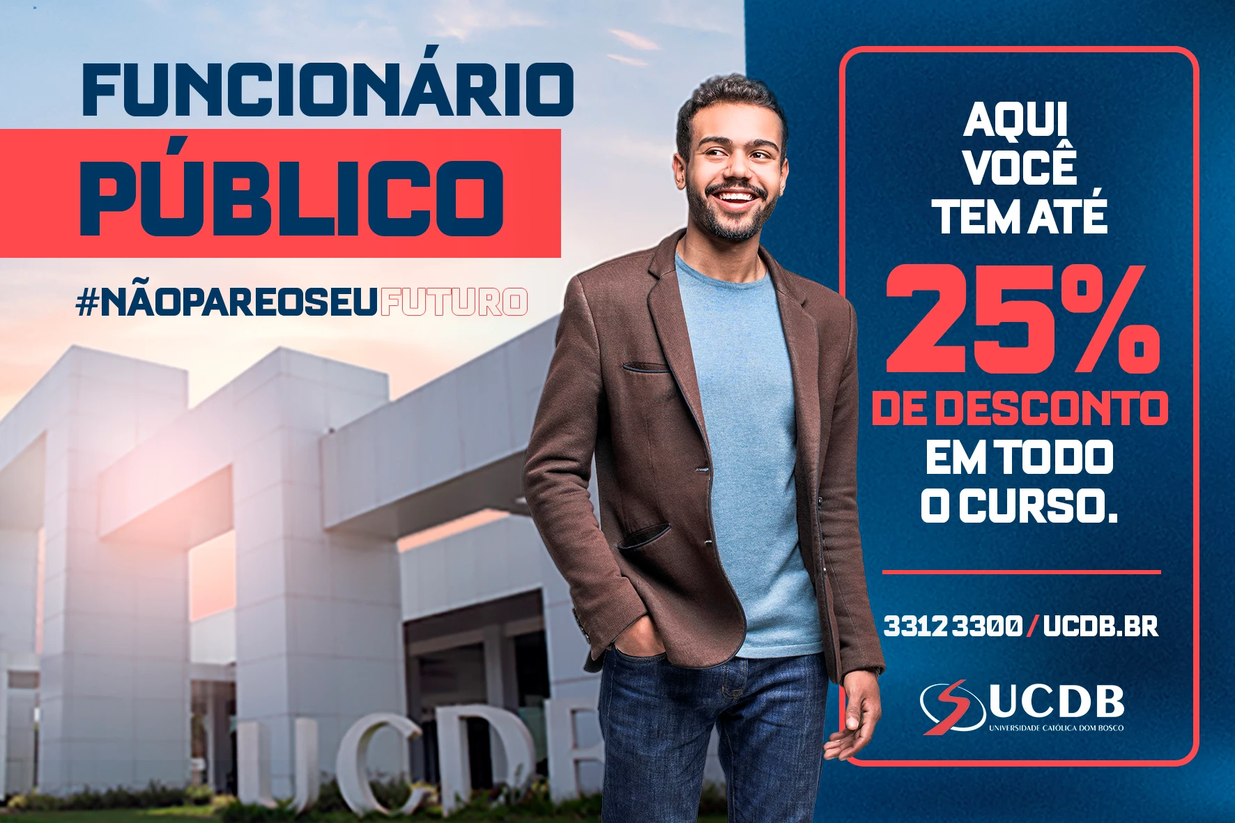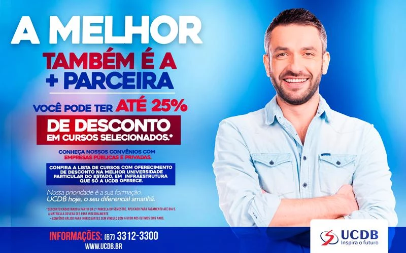 Policiais militares e funcionários públicos (estaduais e municipais de Campo Grande), assim como seus dependentes, têm a oportunidade de iniciar qualquer um dos cursos de graduação da Universidade Católica Dom Bosco (UCDB) com desconto de até 25% em todo o curso. As inscrições para o Vestibular de Inverno 2020 da UCDB podem ser feitas até 3 de agosto.
