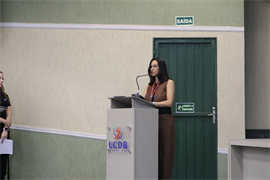 A coordenadora Karla Toledo relembrou toda a história e a contribuição dos docentes na construção e consolidação do mais tradicional curso de Fisioterapia de Mato Grosso do Sul.