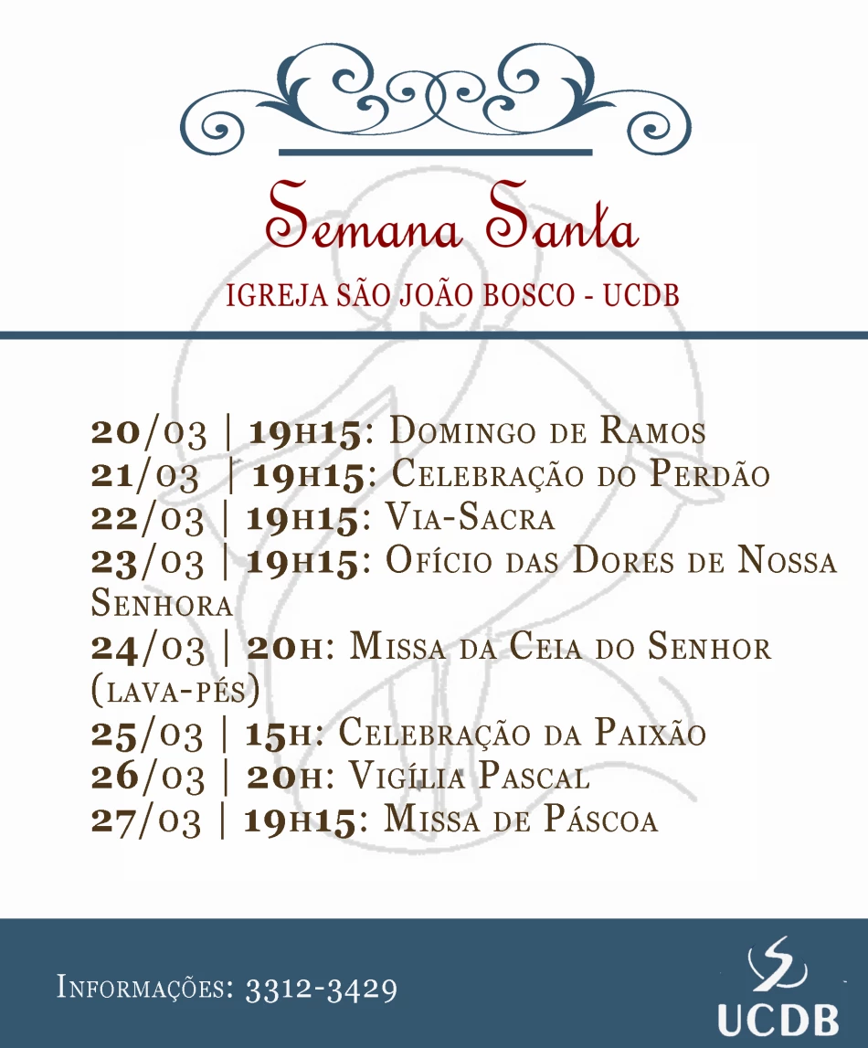 A igreja São João Bosco da Universidade Católica Dom Bosco (UCDB) realiza hoje (25), às 15 horas, a celebração da Paixão e Morte de Cristo na Cruz, para colaboradores e a comunidade em geral. Esse é o único dia do ano em que não é celebrada missa nas igrejas católicas no mundo.