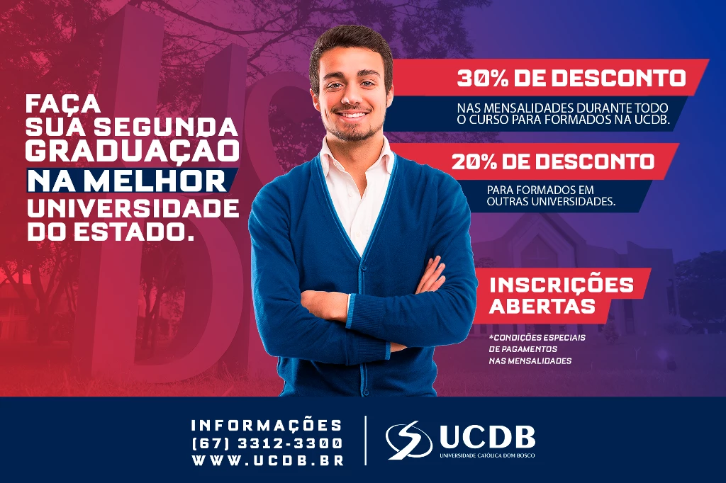 Profissionais graduados que queiram fazer a segunda graduação na Universidade Católica Dom Bosco (UCDB) garantem 30% de desconto (para egressos da UCDB) e 20% de desconto (formados em outras universidades) nas mensalidades durante todo o curso para pagamento efetuado até o dia 5 de cada mês.