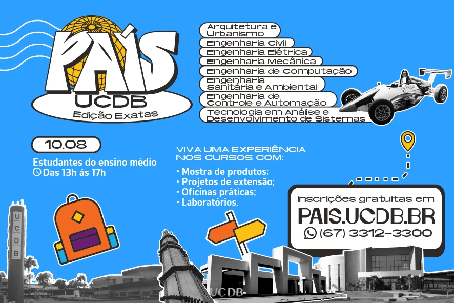 A Universidade Católica Dom Bosco realiza na próxima quarta-feira (10), das 13h às 17 horas, no auditório do bloco C, o País UCDB edição exatas, reunindo estudantes do ensino médio interessados nos cursos de Arquitetura e Urbanismo, Engenharia Civil, Engenharia de Computação, Engenharia de Controle e Automação, Engenharia Elétrica, Engenharia Mecânica, Engenharia Sanitária e Ambiental, Tecnologia em Análise e Desenvolvimento de Sistemas. Será uma imersão na prática dessas profissões e as inscrições são gratuitas e podem ser feitas clicando aqui.