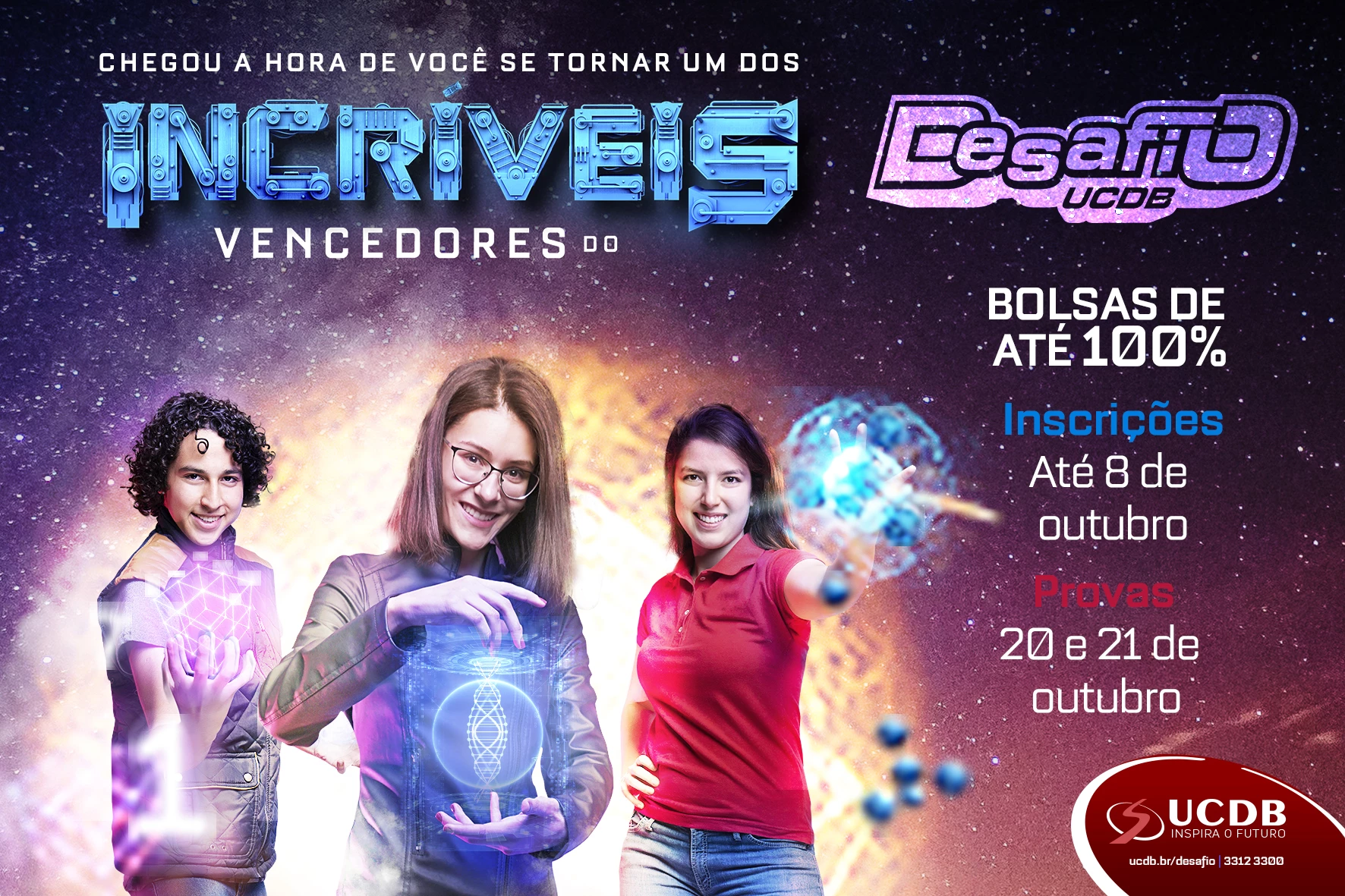 As inscrições para o Desafio UCDB 2018 podem ser feitas pelo site até a próxima segunda-feira (8). As provas serão realizadas nos dias 20 ou 21 deste mês. Os alunos que obtiverem os melhores resultados serão contemplados com bolsas de estudo de 50% a 100% para cursos de graduação da Universidade Católica Dom Bosco (UCDB), a partir do primeiro semestre de 2019.