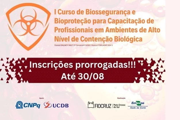 O prazo de inscrição para o I Curso de Biossegurança e Bioproteção para Capacitação de Profissionais em Ambientes de Alto Nível de Contenção Biológica foi prorrogado até o dia 30 de agosto e podem ser feitas gratuitamente pelo site. O evento, que vai ser realizado de 20 a 24 de outubro, é promovido pela Embrapa Gado de Corte e Fiocruz, conta com o apoio da Universidade Católica Dom Bosco (UCDB) e Conselho Nacional de Desenvolvimento Científico e Tecnológico (CNPq).