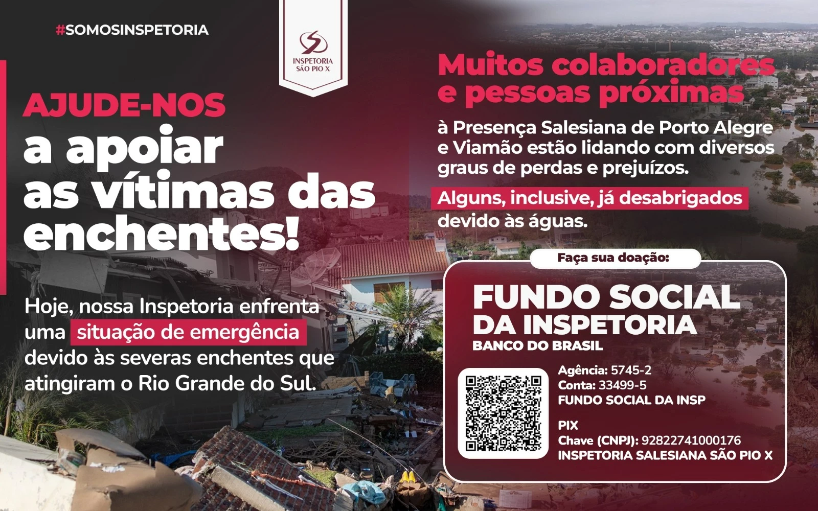 Por isso, a Inspetoria Salesiana São Pio X emitiu um pedido de ajuda a todos da família salesiana em todo o Brasil. “Repassem, por favor, aos Salesianos e amigos de Dom Bosco neste nosso Brasil para que possamos fazer o bem, assim que as condições permitam!”, pediu Pe. Ademir.