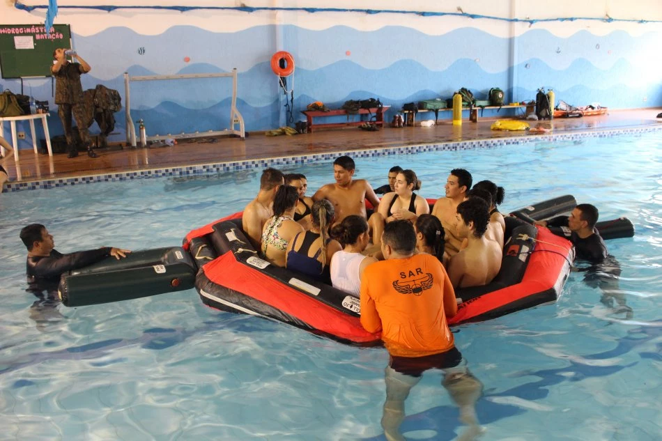 O Esquadrão de Salvamento e Resgate Pelicano da Força Aérea Brasileira abordou o tema “Resgate aeronáutico” em aula prática realizada na quarta-feira (1º), destinada a acadêmicos do curso de Enfermagem da Universidade Católica Dom Bosco (UCDB). Entusiasmados com as atividades na piscina do ginásio da Universidade, os alunos receberam dicas e técnicas de como devem agir em uma operação.