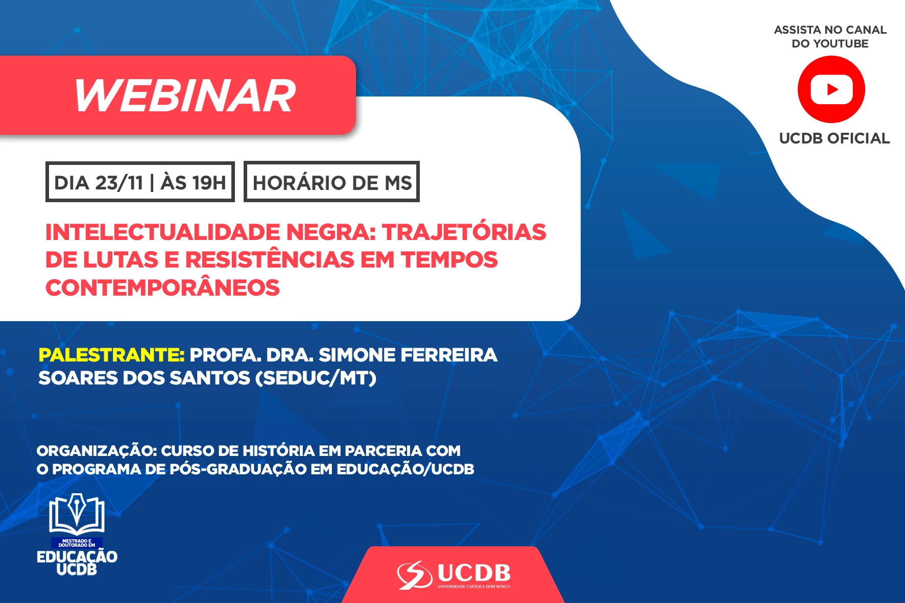 A Universidade Católica Dom Bosco (UCDB), por meio do Programa de Pós-graduação em Educação (PPGE) e cursos de licenciatura, realiza nesta terça-feira (23) a webinar ‘Intelectualidade Negra: Trajetórias de Lutas e Resistências em Tempos Contemporâneos’, com transmissão pelo canal oficial da Católica no YouTube.