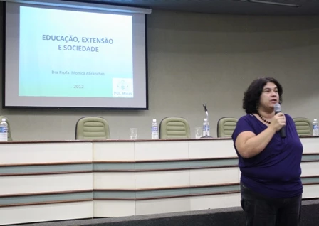 Mônica Abranches foi a palestrante da manhã e abordou “Educação, extensão e sociedade”. “Quando se fala em transformação da realidade, não se pode pensar sem a interação. Temos de saber, também, como a informação vai chegar à sociedade e como a sociedade vai usar a informação. É importante ressaltar que a mudança é demorada, requer paciência.