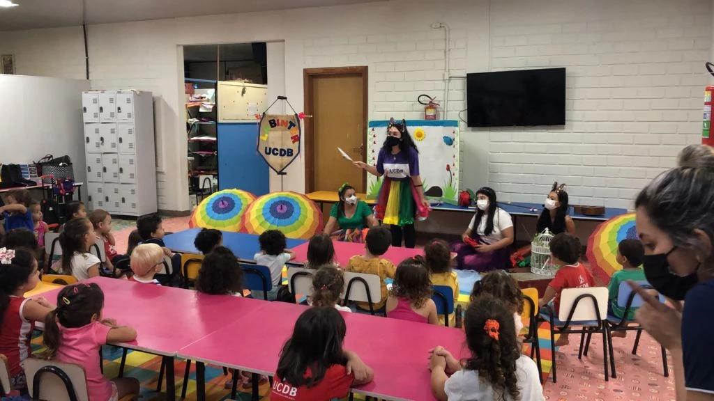 Além da docente, participaram as acadêmicas Maria Liliane, Isabella Mello, Tayla e Vitória Mombrum dos cursos de Ciências Biológicas, Letras, Psicologia e Pedagogia. A apresentação teve a supervisão também das professoras Ana Paula Melim e Evelyn de Oliveira. “Aliamos a contação com músicas, para deixar o momento mais prazeroso para as crianças”, acrescentou Suelen. No Cei da UCDB cerca de 80 crianças de 2 a 5 anos participaram da ação.