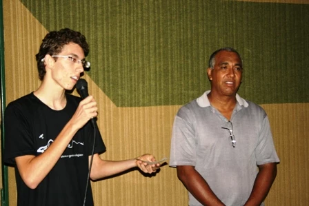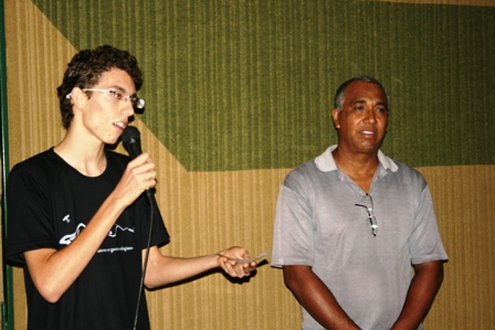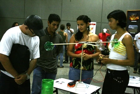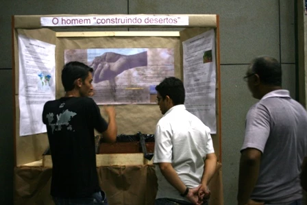 No hall de entrada para o anfiteatro, acadêmicos de Geografia montaram uma pequena feira de conhecimentos para explicar aos visitantes sobre a formação das chuvas no Brasil, os efeitos do aquecimento global, entre outros assuntos.