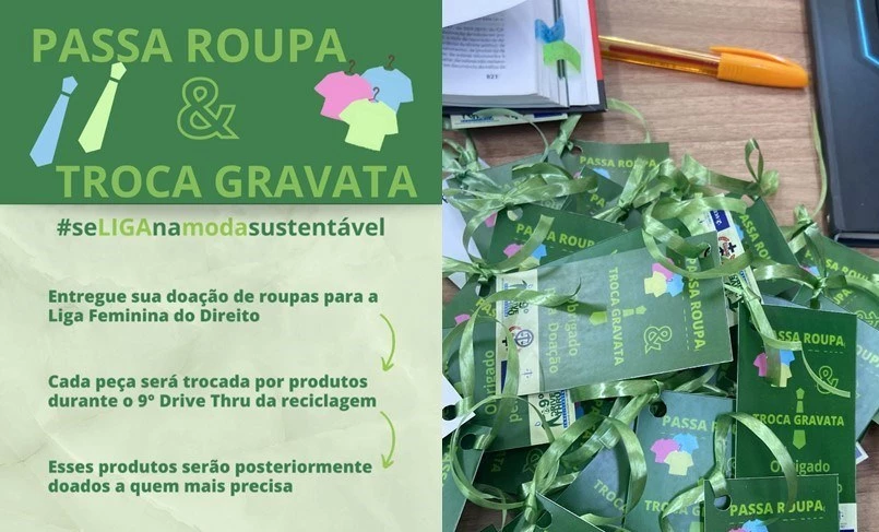 A Liga Feminina de Direito da Universidade Católica Dom Bosco (UCDB) está realizando a ação ‘Passa roupa & Troca Gravata’ para estimular a solidariedade e a sustentabilidade entre os atuais e futuros operadores do Direito. Todas as peças recebidas poderão ser trocadas por produtos de higiene e limpeza ou alimentos não perecíveis na 9ª edição do Drive Thru da Reciclagem. Os produtos arrecadados serão doados para entidades carentes.