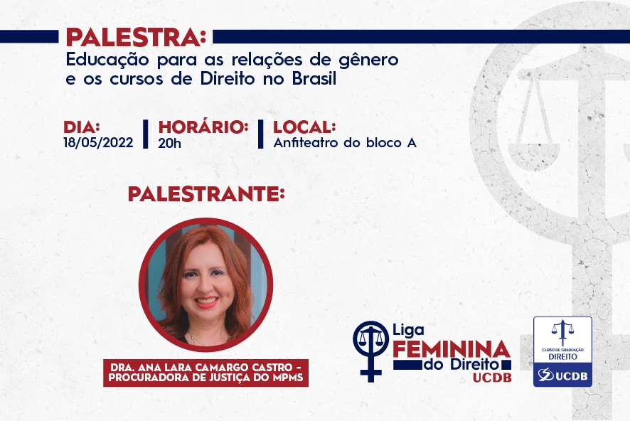A Liga Feminina do Direito da Universidade Católica Dom Bosco (UCDB) realiza nesta quarta-feira (18), às 20 horas, no anfiteatro do bloco A, a primeira ação do grupo, com a palestra “Educação para as relações de gênero e os cursos de Direito no Brasil”, que será ministrada pela procuradora de justiça do Ministério Público do Estado de Mato Grosso do Sul, Dra. Ana Lara Camargo, uma das madrinhas da Liga.