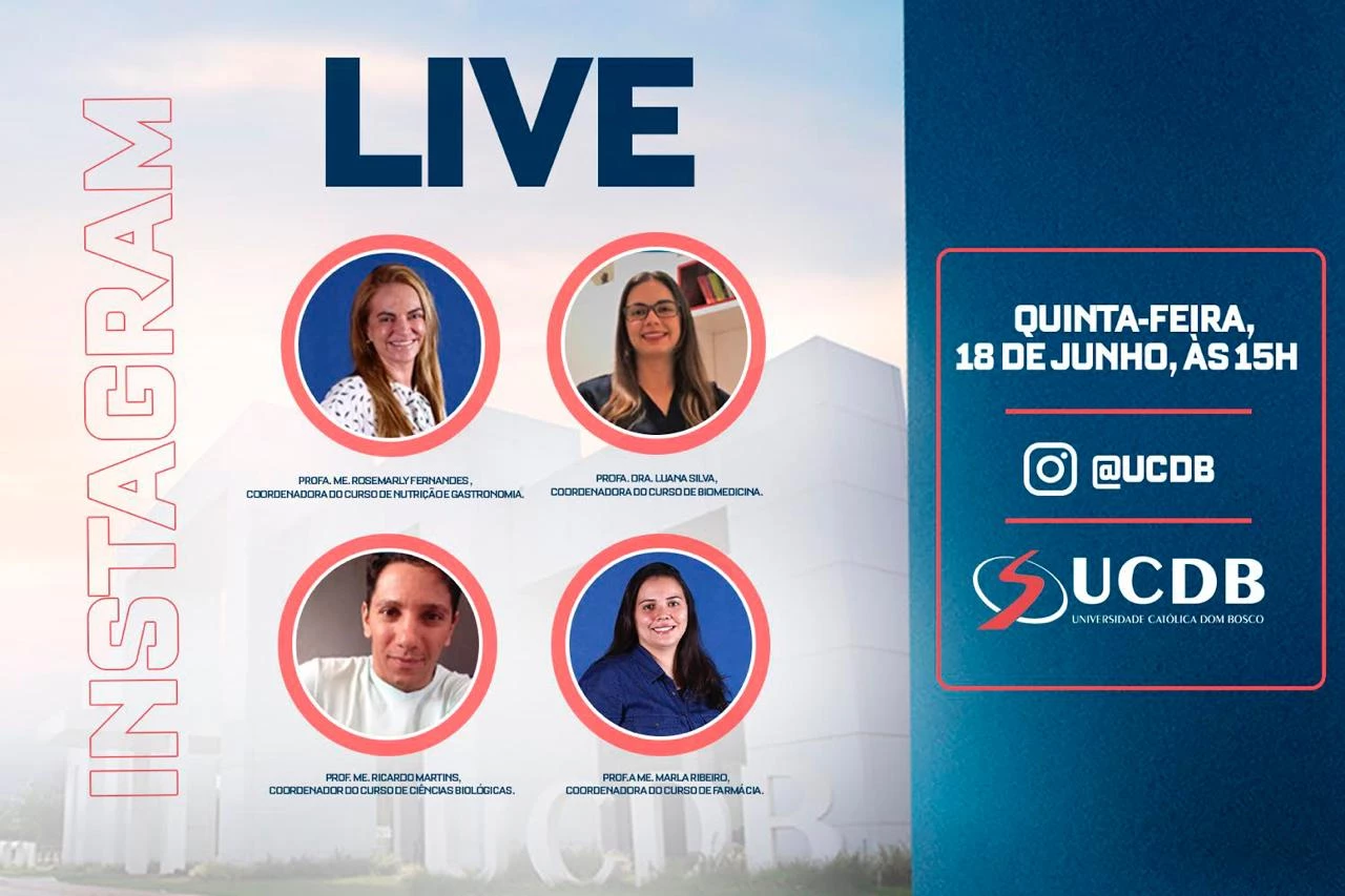 Hoje (18), às 15h, a live promovida pela Universidade Católica Dom Bosco (UCDB), por meio do Instagram (@ucdb), vai abordar os cursos de Ciências Biológicas, Nutrição, Gastronomia, Farmácia e Biomedicina. Em uma conversa descontraída os coordenadores Ricardo Martins, Rosemarly Candil, Marla Miranda e Luana Soares vão expor para os participantes como funciona cada graduação, o cenário atual do mercado de trabalho e, ainda, esclarecer as dúvidas de quem não sabe qual profissão quer seguir.