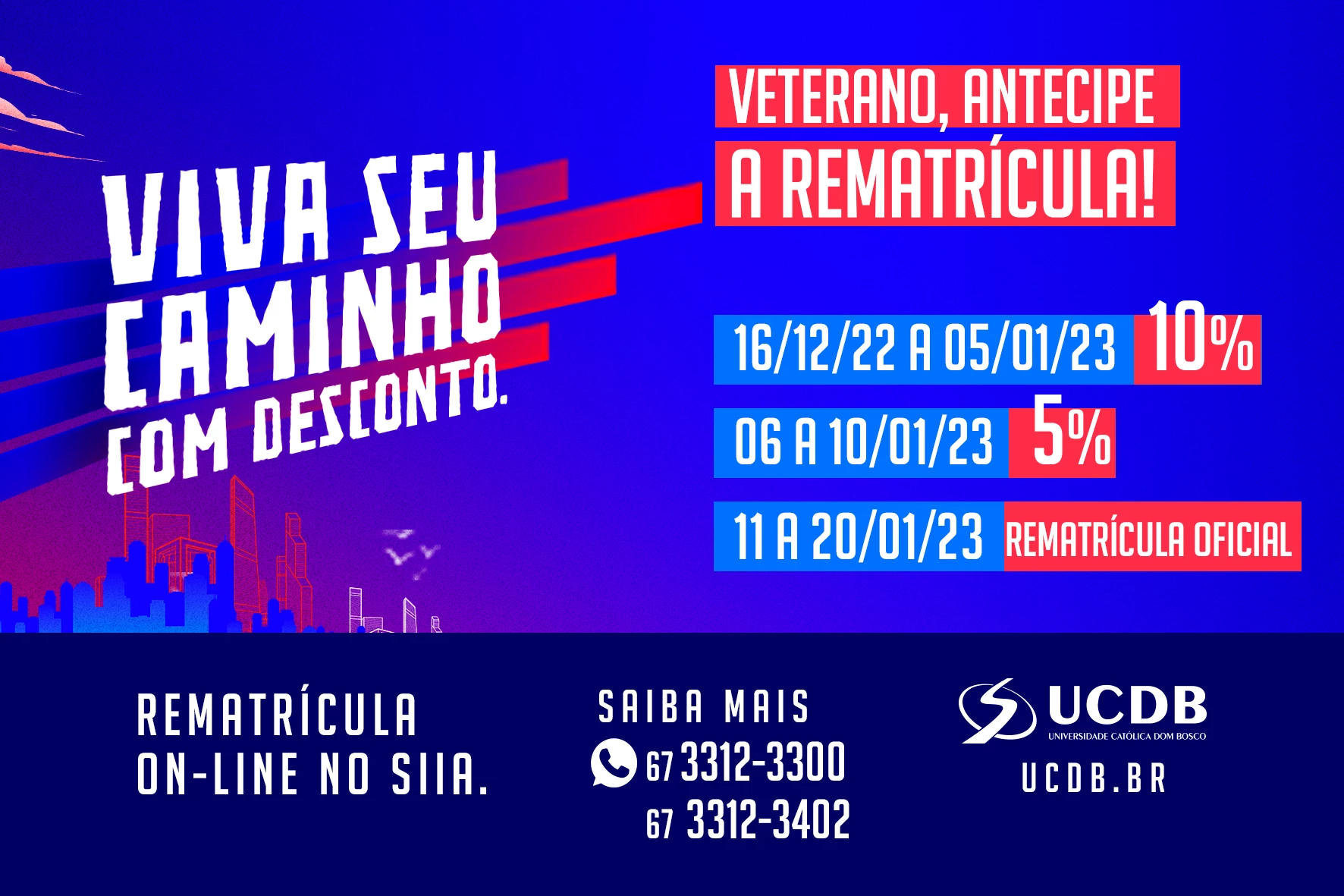 Acadêmicos veteranos da Universidade Católica Dom Bosco (UCDB) podem fazer a matrícula antecipada do primeiro semestre de 2023 com 10% de desconto a partir desta sexta-feira (16) até o dia 5 de janeiro. Para quem efetuar a matrícula entre os dias 6 e 10 de janeiro o desconto será de 5%.