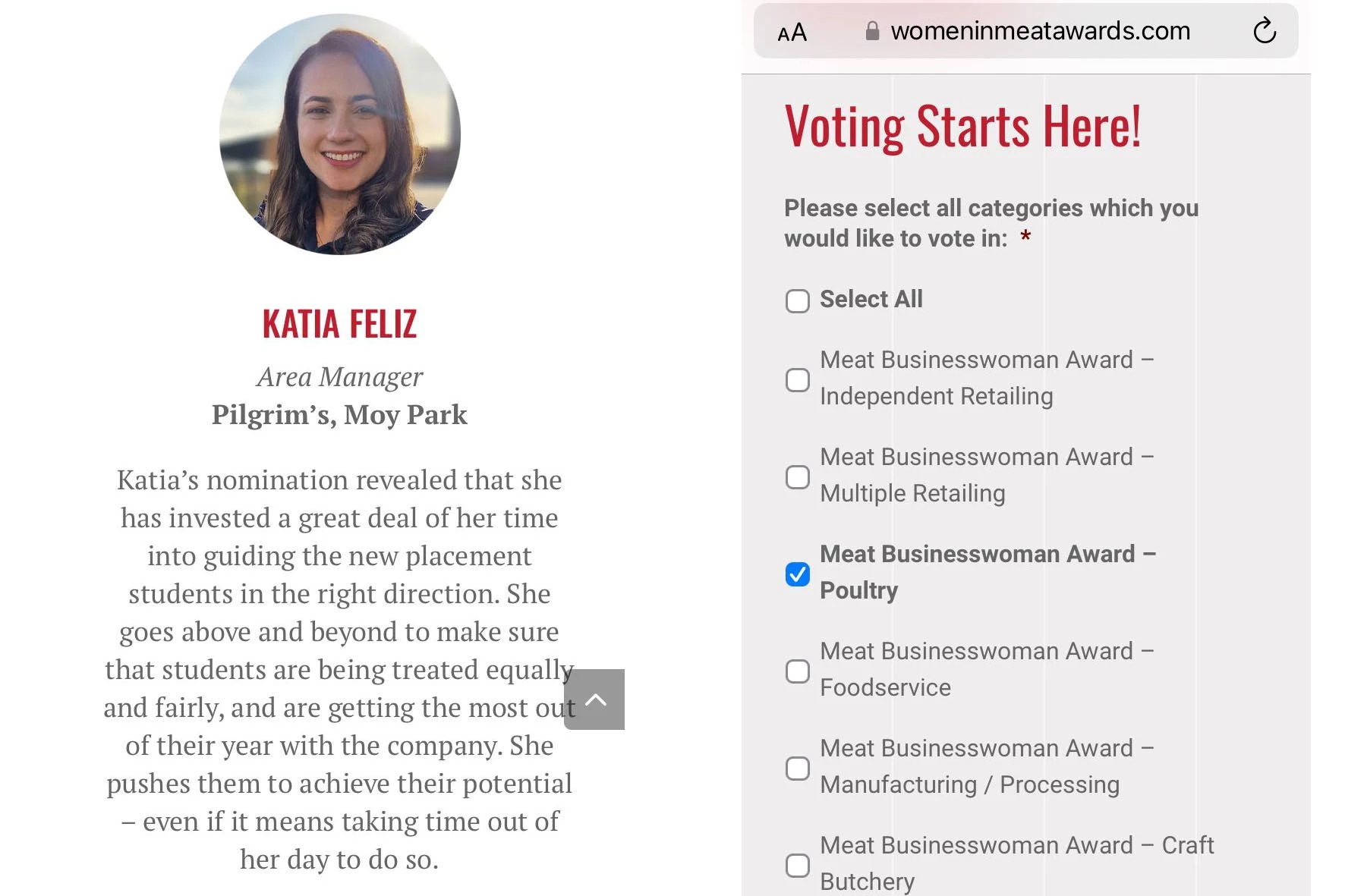 Para ajudar a eleger Kátia Feliz, vote! Você deve escolher a categoria “Meat Businesswoman Award – Poultry” e submeter o voto. Em seguida, preencha seus dados para o voto ser validado.