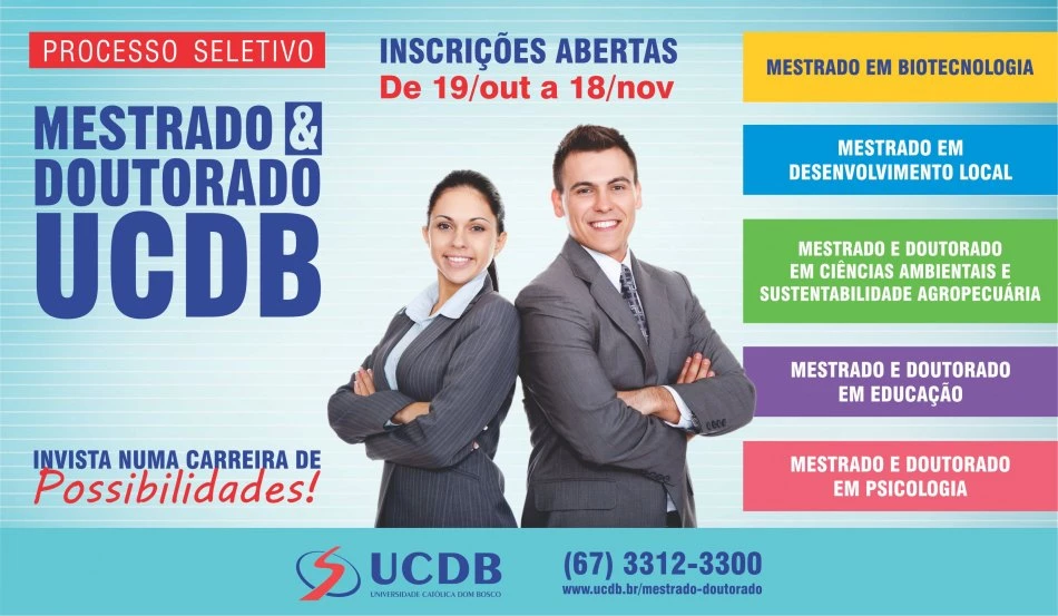 Estão abertas as inscrições para processo seletivo de Programas de Pós-Graduação — Mestrado e Doutorado em diferentes áreas de estudo na Universidade Católica Dom Bosco (UCDB). As inscrições vão até o dia 18 de novembro e podem ser realizadas online, nas páginas de cada curso no site da UCDB.