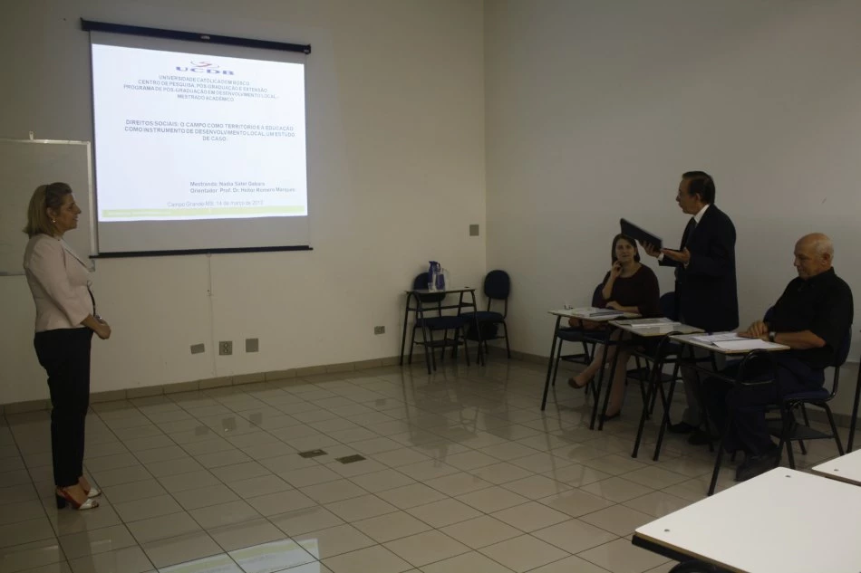 Foi realizada na última quinta-feira (14), na Universidade Católica Dom Bosco (UCDB), a defesa de dissertação da mestranda do Programa de Pós-Graduação Mestrado em Desenvolvimento Local, Nadia Sater Gebara, que teve como tema "Direitos Sociais: O Campo como Território e a Educação como Instrumentos de Desenvolvimento Local".