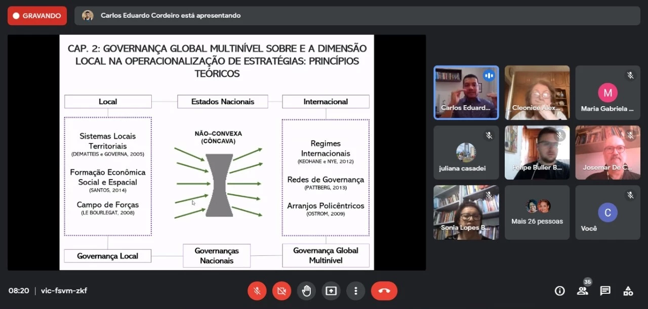 O Programa de Pós-Graduação mestrado e doutorado em Desenvolvimento Local da Universidade Católica Dom Bosco (UCDB) realizou nesta quarta-feira (1º) a defesa da dissertação do mestrando Carlos Eduardo Alves Cordeiro, com o tema ‘Governança global multinível sobre mudanças climáticas: dinâmica local pelo plano abc’, sob a orientação da professora Dra. Cleonice Alexandre Le Bourlegat.