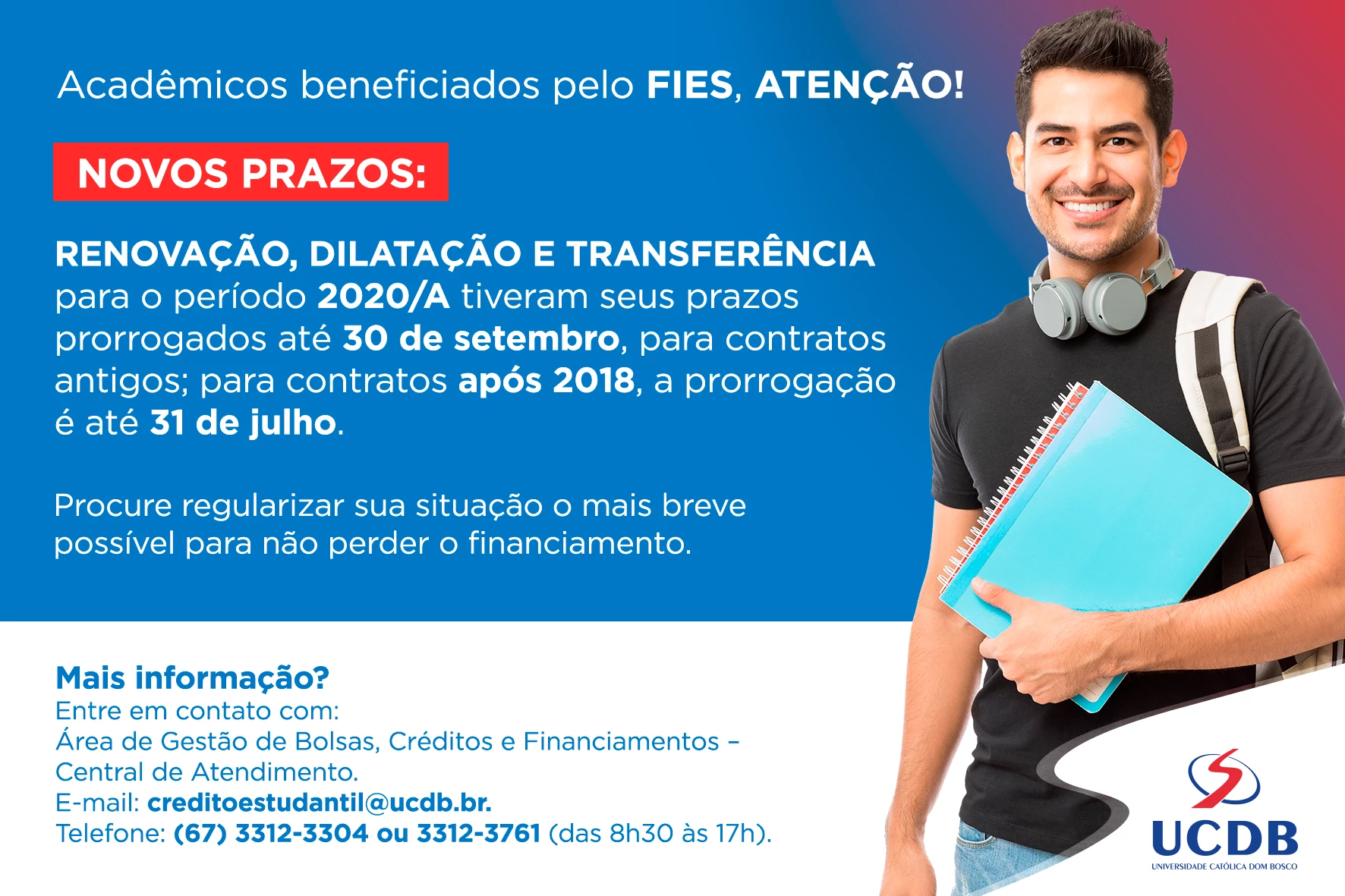 Devido a pandemia do novo coronavírus, o Ministério da Educação (MEC), a renovação do Fundo de Financiamento ao Estudante do Ensino Superior (Fies), assim como dilatação e transferência para o período 2020/A foi estendido até o dia 30 de setembro para contratos antigos e para contratos após 2018 o prazo será até 31 de julho. Acadêmicos beneficiados com o Fies na Universidade Católica Dom Bosco (UCDB), em contratos aderidos até 2017, devem acessar o site http://sisfiesaluno.mec.gov.br/seguranca/principal, realizar o procedimento e imprimir o comprovante de validação de aditamento e os demais, a partir de 2018 o site de acesso é http://sifesweb.caixa.gov.br.