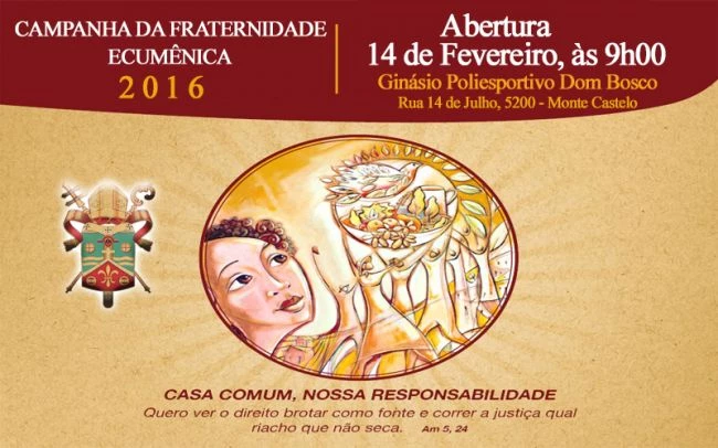 A abertura da Campanha da Fraternidade Ecumênica 2016 – ‘Casa Comum, nossa responsabilidade’, com o lema “Quero ver o direito brotar como fonte e correr a justiça qual riacho que não seca”, será no próximo domingo (14), a partir das 9h, no Ginásio Poliesportivo Dom Bosco. A missa será presidida pelo arcebispo de Campo Grande, Dom Dimas Lara Barbosa e concelebrada pelo bispo auxiliar Dom Mariano, contará ainda com a presença de padres das paróquias pertencentes a arquidiocese, seminaristas, diáconos e fieis.