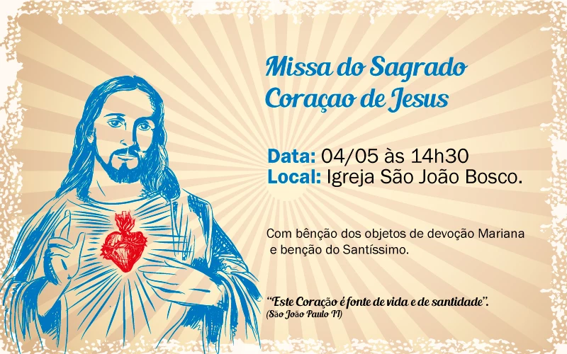 Colaboradores da Universidade Católica Dom Bosco (UCDB) estão convidados a participar nesta sexta-feira (4), às 14h30, da Missa do Sagrado Coração de Jesus na Paróquia Universitária São João Bosco, localizada no campus Tamandaré.